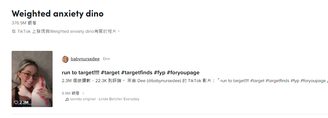 其實(shí)早在4月份,這款來自 Target 公司制作的加重恐龍毛絨玩具就已經(jīng)在 TikTok 走紅,主要是因?yàn)橛芯W(wǎng)紅和 TikTok 用戶為了緩解焦慮,購買了該產(chǎn)品并上傳至 TikTok 視頻后,迅速在平臺引起軒然大波,產(chǎn)品甚至一度被賣到缺貨。