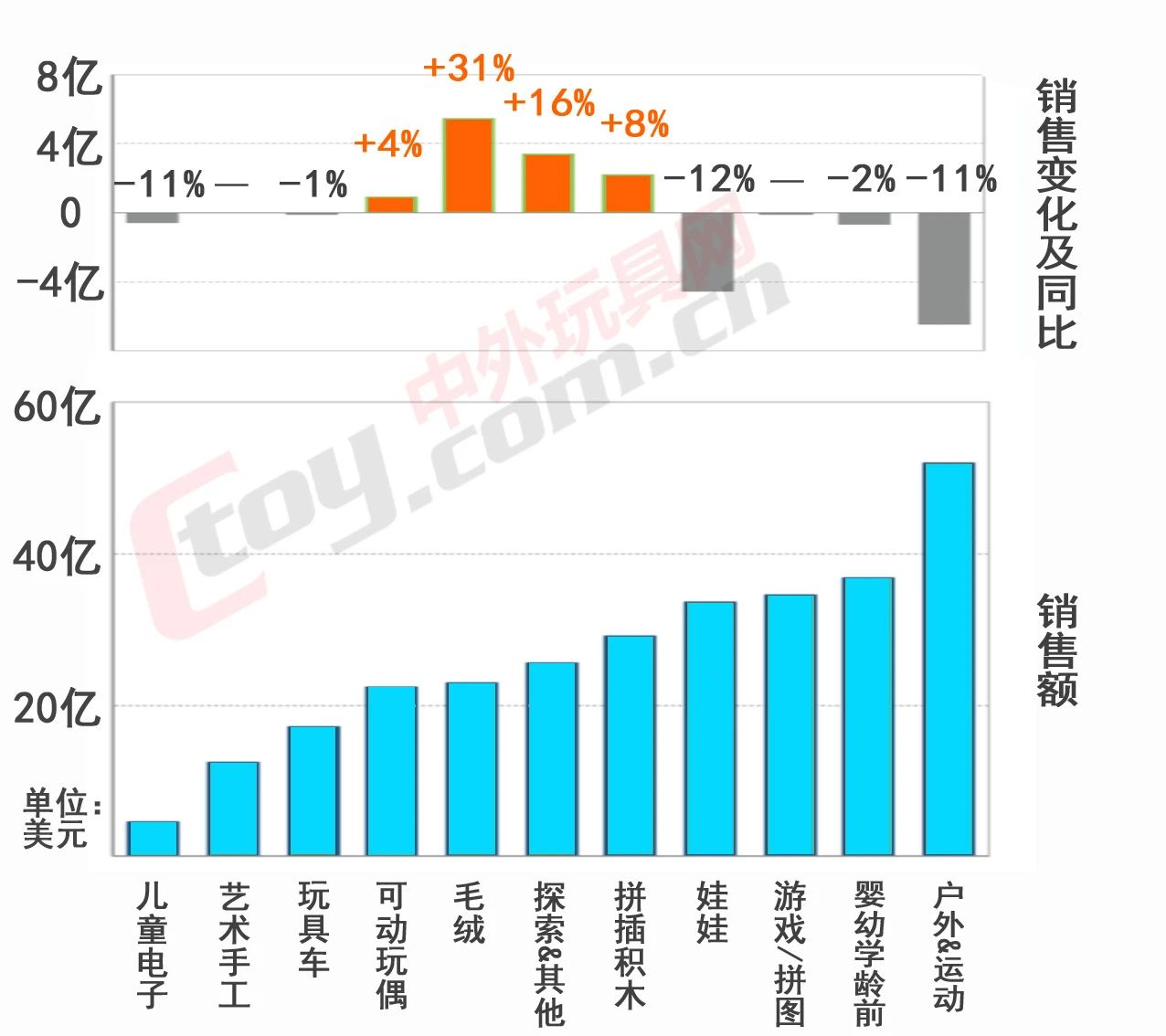 NPD追蹤的11個大類中,有4個漲勢突出。毛絨玩具漲幅最大,達到31%。緊隨其后的是探險及其他類,同比增長16%。上述兩類也是從2019 年起復合年增長率 (CAGR) 最大的品類,毛絨玩具達到23%,探險及其他類為22%。其余增長的兩類是拼裝積木(+8%)和可動玩偶(+4%)。戶外和運動玩具仍然是體量最大的品類,2022年取得52億美元的銷售額,占整體玩具銷售的18%。但它同時也是銷售額下降最多的品類,同比下降11%,占年度銷售額下降的52%。