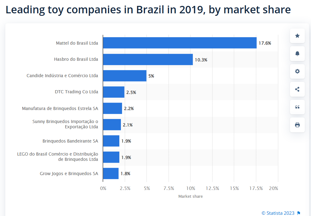 從市場(chǎng)占有率來看,美泰巴西分公司在疫情前,就已經(jīng)是當(dāng)?shù)氐谝煌婢吖?,孩之寶跟隨其后
