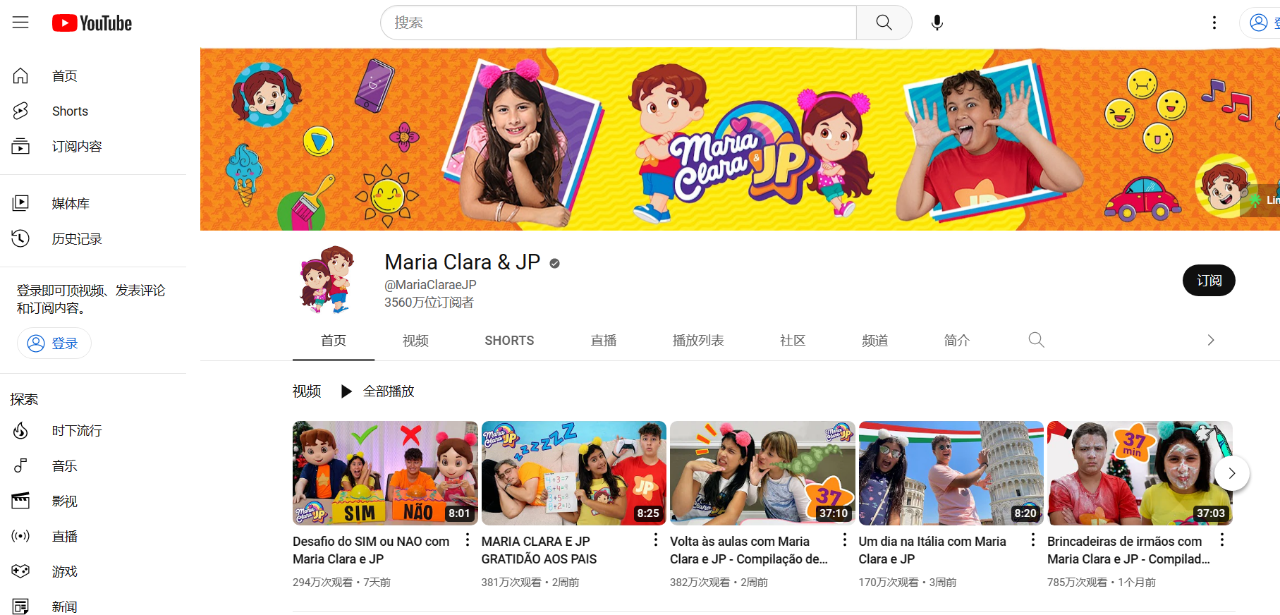 Maria Clara & JP的YouTube頻道主頁,新更的視頻都有數(shù)百萬的播放量