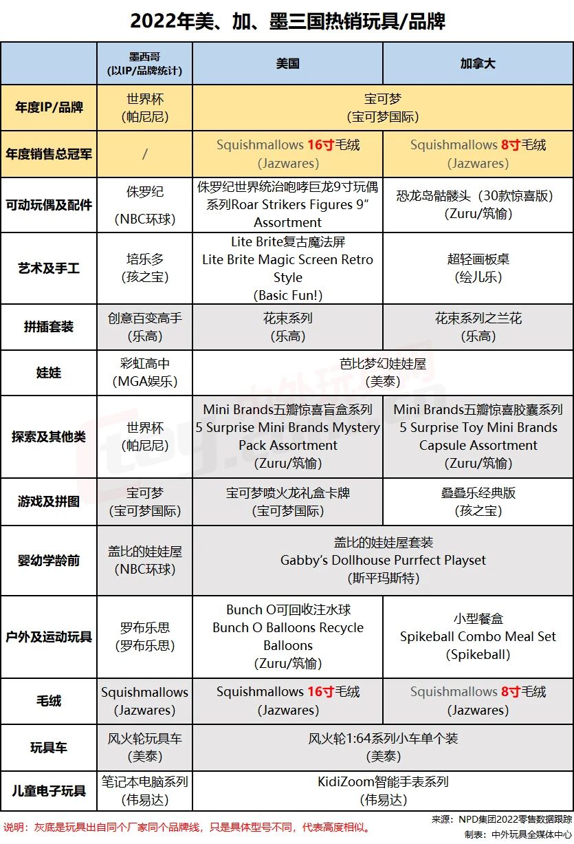雖然巴西遠(yuǎn)離美國本土,其消費(fèi)喜好深受歐美(尤其是美國)影響。那么毗鄰美國的墨、加兩國,就更不可避免。這三國的熱銷玩具,呈現(xiàn)出高度雷同的現(xiàn)象: