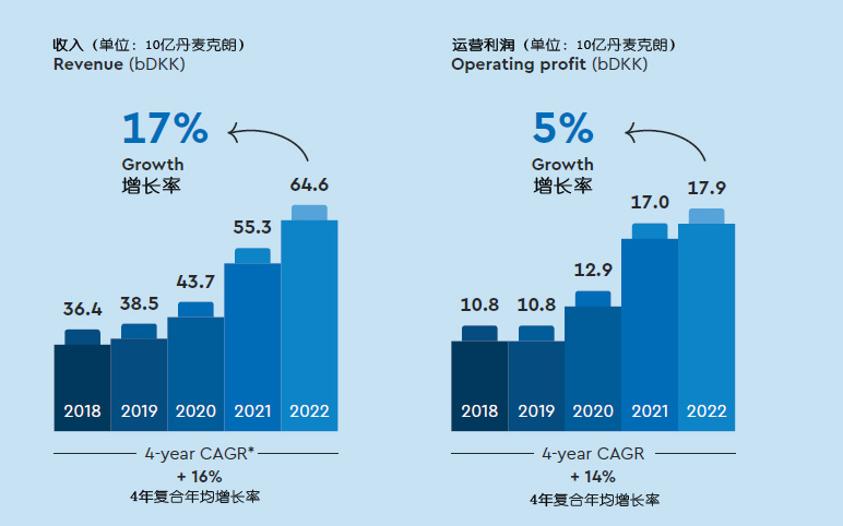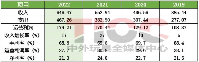 2022年,樂高集團總收入達到646.47億丹麥克朗(約為91.67億美元、638.65億元人民幣),同比增長17%,這也是自2020年新冠肺炎疫情爆發(fā)以來連續(xù)3年獲得兩位數(shù)增長,2020、2021、2022年三年的增長率分別達到13%27%17%,可謂高歌猛進,遠遠高于行業(yè)整體水平。營業(yè)利潤同比增長5%,達179億丹麥克朗(約為178億元人民幣);凈利潤同比增長4%,達138億丹麥克朗(約為137億元人民幣)。