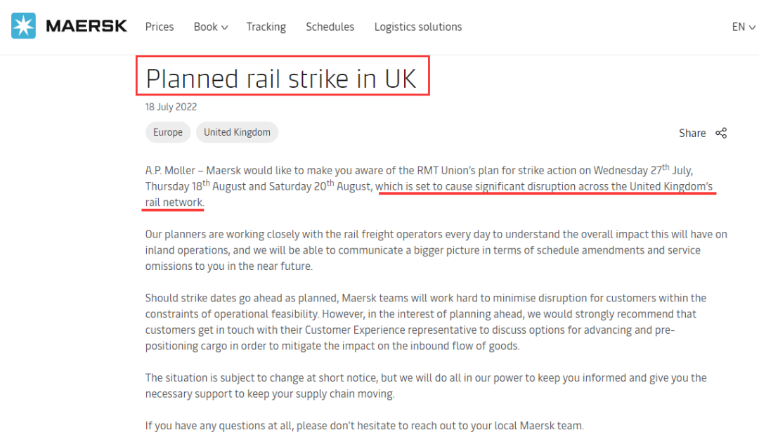 值得注意的是,英國(guó)鐵路系統(tǒng)超過5萬名工作人員繼6月份舉行近30年最大規(guī)模的罷工活動(dòng)后甚至已經(jīng)把罷工計(jì)劃安排到了8月份,將分別在818日、820日繼續(xù)罷工。馬士基發(fā)布公告稱這將給整個(gè)英國(guó)的鐵路網(wǎng)絡(luò)造成重大破壞。