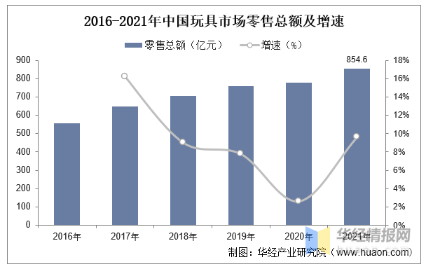隨著我國玩具制造業(yè)持續(xù)發(fā)展,零售規(guī)模穩(wěn)定增長。根據(jù)中國玩具和嬰童用品協(xié)會數(shù)據(jù),從2016年到2021年,我國玩具市場零售總額逐年增長,從556億元增長至854.6億元,年復合增長率為8.98%,行業(yè)發(fā)展態(tài)勢良好,市場空間不斷拓展。
