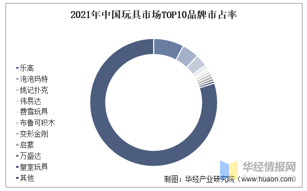 與發(fā)達國家相比,我國玩具行業(yè)目前市場格局較為分散,國產(chǎn)玩具品牌的市占率和影響力在國內仍整體偏弱。2021年,在中國玩具市場TOP10品牌中,樂高占據(jù)領導地位,占比7.7%。其次是泡泡瑪特,達到4.3%的市占率,排名第二,第三名為姚記撲克,市占率為3.1%,其余玩具品牌占比均不足1%。